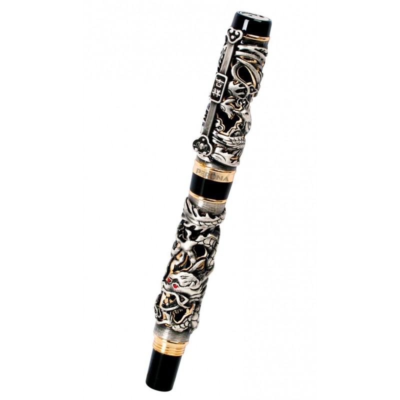 Zawiera: zestaw upominkowy z 1 długopisem Dragon ze skuwką i korpusem w kolorze czarnym z wygrawerowanymi w reliefie orientalnymi elementami w kolorze złotym i oczami czerwonego smoka, zdejmowaną skuwką, systemem pisania w formie kulki, logo marki wygrawerowanym na centralnym pierścieniu oraz 1 etui na długopis z wyściełaną zewnętrzną stroną i wyłożonym wewnątrz logo w kolorze srebrnym.