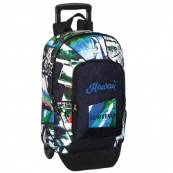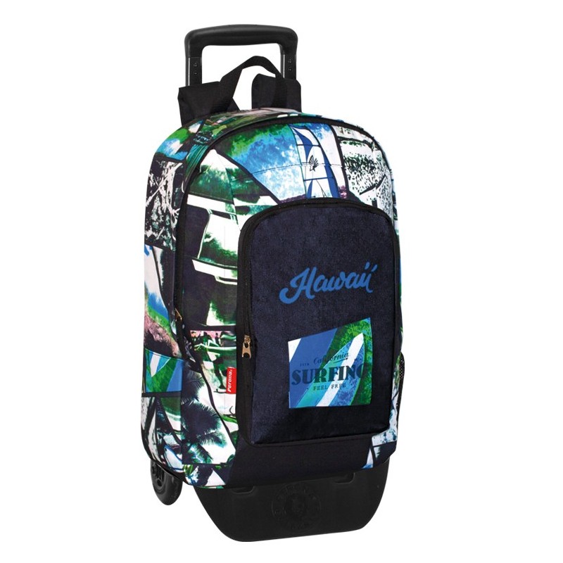 Obejmuje: 1 plecak młodzieżowy w kolorze niebiesko-zielonym o nowoczesnym wzornictwie, dwie główne komory zapinane na zamek błyskawiczny, przednia kieszeń zapinana na zamek błyskawiczny, wewnętrzna wyściółka ochronna, boczna kieszeń z siatkowym uchwytem na butelkę, specjalna wewnętrzna przegroda na laptopa i tablet, wyściełane uchwyty, oddychający i z regulacją rozmiaru, wyściełane plecy, ukryty system do adaptacji wózka, uchwyt na górze i paski odblaskowe na paskach naramiennych oraz 1 wózek z podkładkami do mocowania do podstawy, górna klapa do adaptacji do plecaków, składana konstrukcja i podwójna oś z powłoką antykorozyjną.