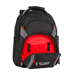 Ten plecak na komputer lub tablet jest wykonany z poliestru z małymi detalami w kolorze czerwonym i posiada wiele przegródek. Widać na nim, że ma dużą komorę główną o dużej pojemności, wyłożoną wewnątrz czerwoną podszewką i zamykaną na zamek błyskawiczny. Posiada wyściełaną przegrodę na laptop 15,6'' i tablet, trzy przednie kieszenie zewnętrzne, boczną kieszeń na butelki oraz tylną kieszeń, w której można schować paski na ramię.