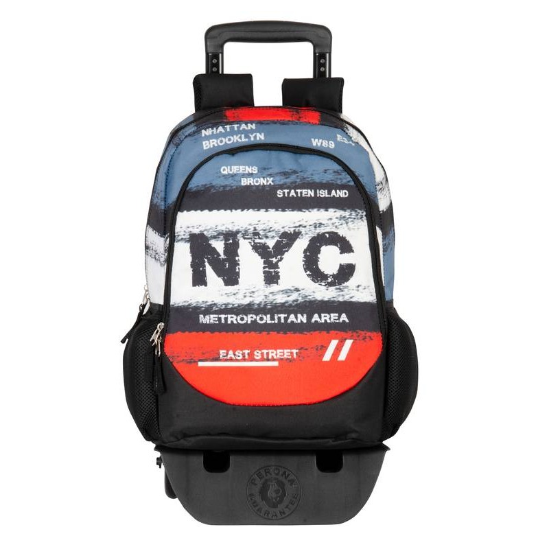 W zestawie: 1 wyjmowany plecak młodzieżowy w kolorze czarnym, szarym i czerwonym z motywem NYC, dwiema komorami zapinanymi na zamek błyskawiczny, wewnętrzną podszewką, boczną kieszenią z siatki na butelki, regulowanymi wyściełanymi uchwytami, wyściełanymi plecami, paskiem dopasowującym się do uchwytów plecaka, tylną kieszenią bezpieczeństwa, paskami odblaskowymi na paskach na ramiona oraz 1 wózek dziecięcy ze szczelinami w podstawie, składaną konstrukcją i podwójną osią pokrytą powłoką antykorozyjną.