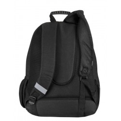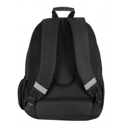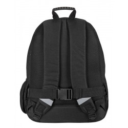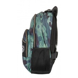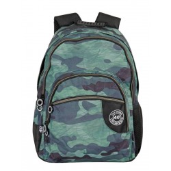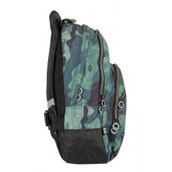 Zawiera: 1 podwójny plecak szkolny w kolorze czarnym, niebieskim i zielonym z wzorem kamuflażu, z wyszytym logo, wyjmowanym systemem nośnym do wózków plecakowych, wyściełanymi, oddychającymi i regulowanymi paskami na ramiona, regulowaną wkładką na plecy, wewnętrzną podszewką ochronną, taśmami odblaskowymi na paskach na ramiona, podwójnie wzmocnioną podstawą, uchwytem z tworzywa sztucznego na górze, przednią kieszenią z dwiema przegrodami, indywidualnie dopasowanymi uchwytami i boczną kieszonką z siatki na butelkę.