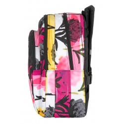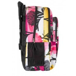 Zawiera: 1 podwójny plecak szkolny w kolorze fioletowym, białym i czarnym z motywem kwiatowym, z wyszytym logo, ukrytym systemem adaptacji do wózka, wyściełanymi, przenośnymi i regulowanymi uchwytami, wyściełanym oparciem dla większego komfortu, wewnętrzną podszewką ochronną, paskami odblaskowymi na paskach na ramiona, paskiem na rękę na górze, podwójną przestrzenią wewnętrzną z zamkiem błyskawicznym, przednią kieszenią z zamkiem błyskawicznym i boczną kieszenią z siatki na butelki.