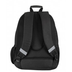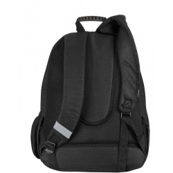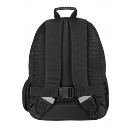 Zawiera: 1 podwójny plecak szkolny w kolorze czarnym, niebieskim i białym o nowoczesnym wzornictwie, z wyszytym logo, wyjmowanym systemem nośnym do wózków plecakowych, wyściełanymi, oddychającymi i regulowanymi uchwytami, regulowaną wyściółką pleców, wewnętrzną podszewką ochronną, paskami odblaskowymi na paskach na ramiona, podwójnie wzmocnionym dnem, uchwytem z PVC na górze, przednią kieszenią z dwiema przegródkami, indywidualnie dopasowanymi uchwytami i boczną kieszonką z siatki na butelkę.
